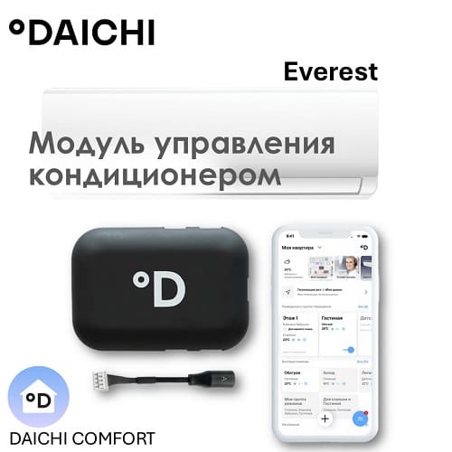 Wi-Fi модуль — устройство, выполняющее функцию передачи сигнала между прибором и точкой доступа Wi-Fi. Девайс специально разработан для кондиционеров Daichi серии Everest, и состоит из специального провода и управляющего модуля. Wi-Fi модуль не нуждается в сложной установке: просто вставьте переходник (проводок) в специальный разъем внутреннего блока, подключите в него его модуль, настройте, и наслаждайтесь управлением со смартфона. Управление прибором осуществляется через фирменное мобильное приложение «Daichi Comfort», которое доступно в Apple Store и Google Play, или голосовые помощники «Алиса», «Маруся» и «Салют».