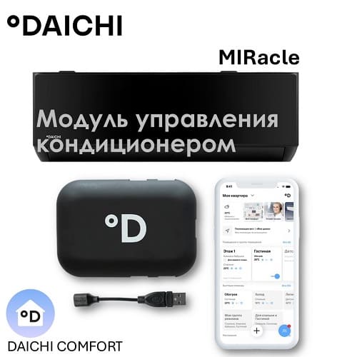 Wi-Fi модуль — устройство, выполняющее функцию передачи сигнала между прибором и точкой доступа Wi-Fi. Девайс специально разработан для кондиционеров Daichi серии Miracle On/Off, и состоит из специального провода и управляющего модуля. Wi-Fi модуль не нуждается в сложной установке: просто вставьте переходник (проводок) в специальный разъем внутреннего блока, подключите в него его модуль, настройте, и наслаждайтесь управлением со смартфона. Управление прибором осуществляется через фирменное мобильное приложение «Daichi Comfort», которое доступно в Apple Store и Google Play, или голосовые помощники «Алиса», «Маруся» и «Салют».