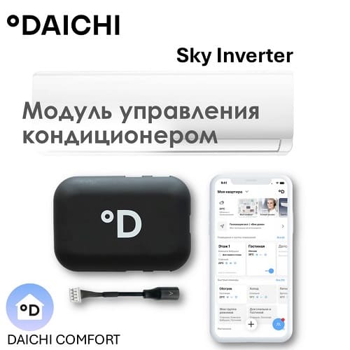 Wi-Fi модуль — устройство, выполняющее функцию передачи сигнала между прибором и точкой доступа Wi-Fi. Девайс специально разработан для кондиционеров Daichi серии Sky Inverter, и состоит из специального провода и управляющего модуля. Wi-Fi модуль не нуждается в сложной установке: просто вставьте переходник (проводок) в специальный разъем внутреннего блока, подключите в него его модуль, настройте, и наслаждайтесь управлением со смартфона. Управление прибором осуществляется через фирменное мобильное приложение «Daichi Comfort», которое доступно в Apple Store и Google Play, или голосовые помощники «Алиса», «Маруся» и «Салют».