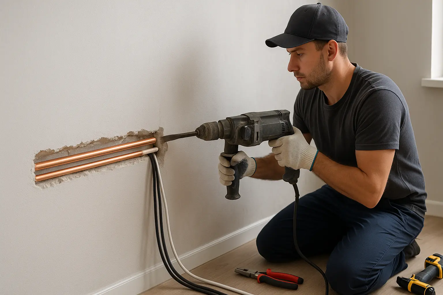 Работа выполняется в два этапа: сначала сверление отверстия, штробление стен и прокладка трассы (медных трубок, кабелей и дренажа), а после окончания ремонта — монтаж внутреннего и наружного блоков кондиционера. Такой подход экономит средства и делает результат аккуратным и долговечным.